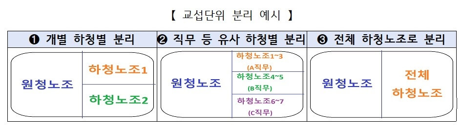 노동부는 교섭단위 분리를 다음과 같은 세 가지 방식으로 예시를 들었습니다.